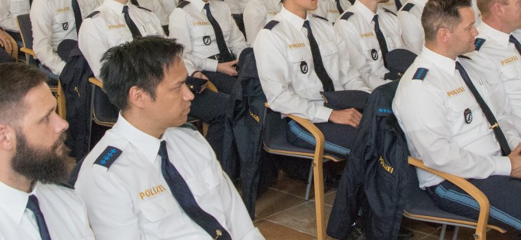 Die gut 170 Polizistinnen und Polizisten traten erstmalig mit ihrer neuen Uniform in Erscheinung. Erster Bürgermeister Michael Göth zeigte sich erfreut: „Bisher sind alle Anwärter in den Rathaussaal gekommen, aber soviel waren es noch nie.“ Göth ging kurz auf die Stadtgeschichte ein und ermutigte die Anwärter sich nach Dienstschluss in der Stadt umzusehen. Darüberhinaus ging er auf das kulturelle Angebot ein.