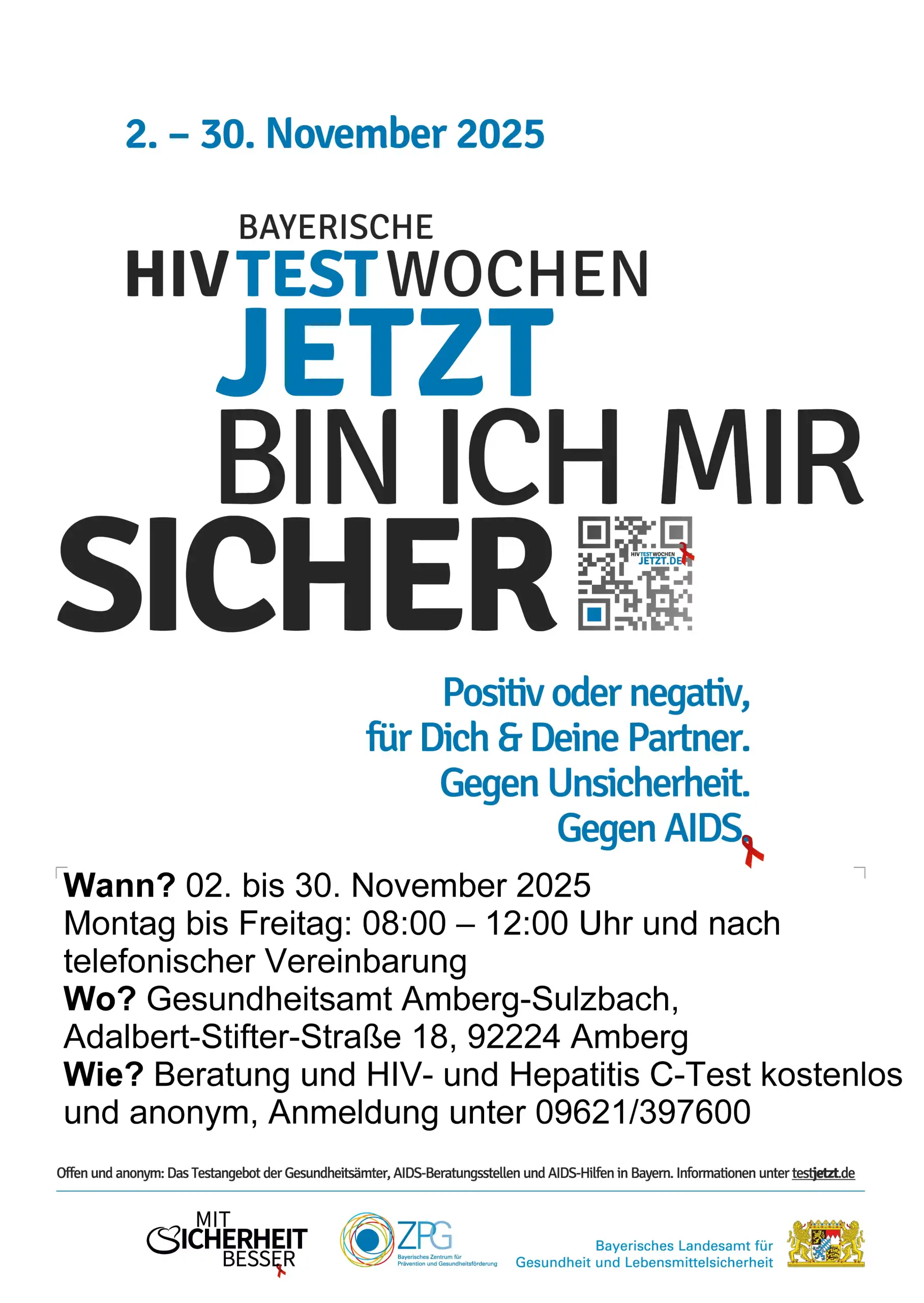 Bayerische HIV-Testwochen, 2. – 30. November 2025 By Stadt Sulzbach-Rosenberg Posted 27. Oktober 2025 In Rathaus aktuell Bayerische HIV-Testwochen, 2. – 30. November 20252025-10-272025-10-27https://www.suro.city/wp-content/uploads/logo_stadt_sulzbach-rosenberg_zw.svgStadt Sulzbach-Rosenberghttps://www.suro.city/wp-content/uploads/2025/10/hiv_testwochen.webp200px200px Die Bayerischen HIV-Testwochen 2025 finden vom 2. – 30. November statt. Es werden wieder zahlreiche Aktionen und Veranstaltungen in ganz Bayern stattfinden. Falls Sie Beratung zu HIV & AIDS suchen oder an einem Test interessiert sind, finden Sie hier das ganze Jahr über Adressen von bayerischen Beratungs- und Teststellen.