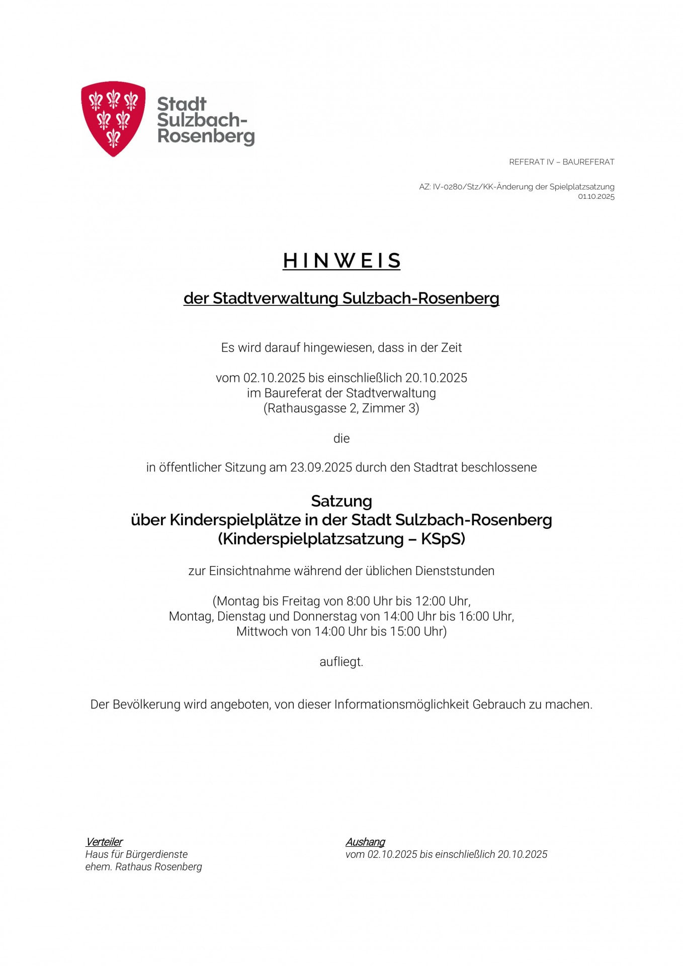 Der Stadtrat hat am 23.09.2025 den Satzungsbeschluss zu der Satzung über Kinderspielplätze in der Stadt Sulzbach-Rosenberg (Kinderspielplatzsatzung – KSpS) gefasst. Näheres s. Hinweis.