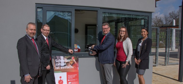 Eintrittskarten im Waldbad kann man nun auch bargeldlos erwerben. Zusammen mit der Sparkasse und den Angestellten der Stadtkasse testete Bürgermeister Michael Göth das neue EC-Karten Terminal. Die ersten Besucher, welche ihre Eintrittskarte bargeldlos bezahlen, bekommen einen Wasserball geschenkt.