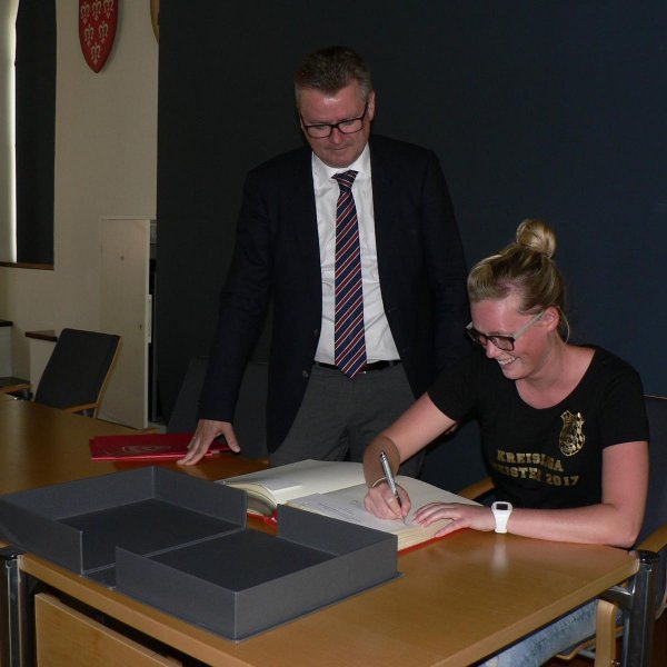 Gleich doppelten Grund zum Feiern hat der TuS Rosenberg dieser Tage. Die Fußballdamenmannschaft gelang der Aufstieg in die Bezirksliga, die Herren der 1. Mannschaft spielen in der neuen Saison in der Kreisliga. Erster Bürgermeister Michael Göth, selbst eingefleischter Fußballfan, empfing die beiden Teams samt ihren Trainern Thomas Grundler und Rainer Summerer sowie der Spartenleitung im Rathaussaal. „Unser Rathaus soll eine verbindende Funktion zwischen Stadtpolitik und Öffentlichkeit sein. Dieser Anlass unterstreicht das wieder einmal.“ Das Stadtoberhaupt bedankte sich noch bei den Fußballerinnen für die Einladung zur Meisterfeier. Anschließend wurde es laut im Saal: Der Rathauschef wünschte sich nämlich, dass die Sportlerinnen noch einmal ihr Aufsteigerlied anstimmten. Zum Dank gab es von den Vertretern der Fraktionen eine Rose. Die erfolgreichen Fußballerinnen und Fußballer des TuS Rosenberg verewigten sich im Goldenen Buch der Stadt, bevor man die Feierstunde bei einem Imbiss ausklingen ließ.