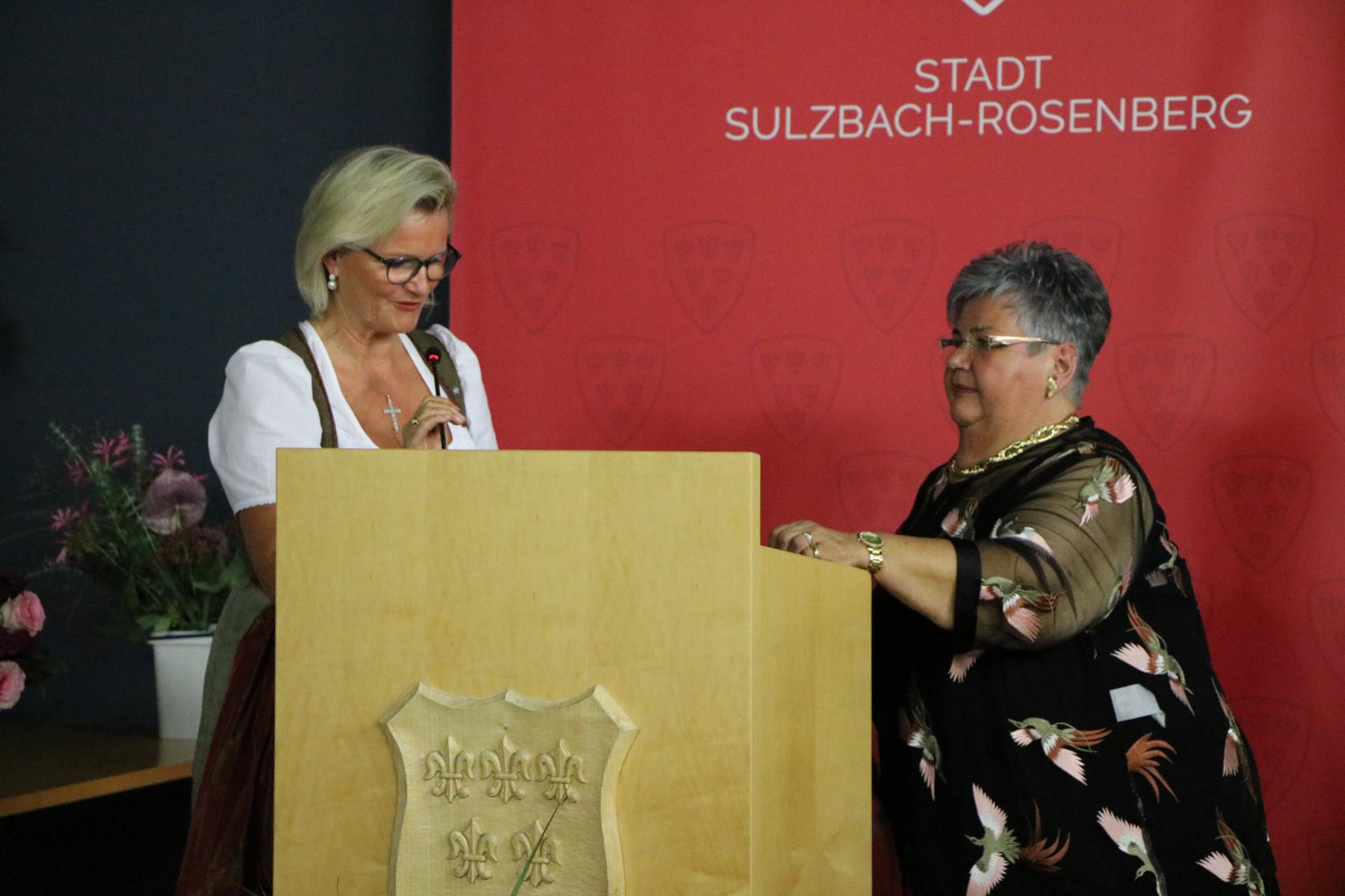 Wie sehr die Schlemmerwochen ein Leuchtturmprojekt auch über die Stadt- und Landkreisgrenzen hinaus mittlerweile sind, zeigte auch, dass sowohl die Präsidentin des Bayerischen Hotellerie- und Gaststättenverbandes, Angela Inselkammer, als auch der DEHOGA-Landesgeschäftsführer Dr. Thomas Geppert zum Jubiläumsabend nach Sulzbach-Rosenberg kamen. Sie hatten für die frischgebackene Wirtschaftsförderpreisträgerin der Stadt Sulzbach-Rosenberg, Inge Girbert, eine Überraschung dabei: Girbert wurde von ihnen für ihr langjähriges Engagement mit der Verdienstmedaille mit Ehrennadel in Silber der DEHOGA ausgezeichnet. Auch Bezirksvorsitzender Hans-Jürgen Nägerl gratulierte Girbert zu dieser Auszeichnung.