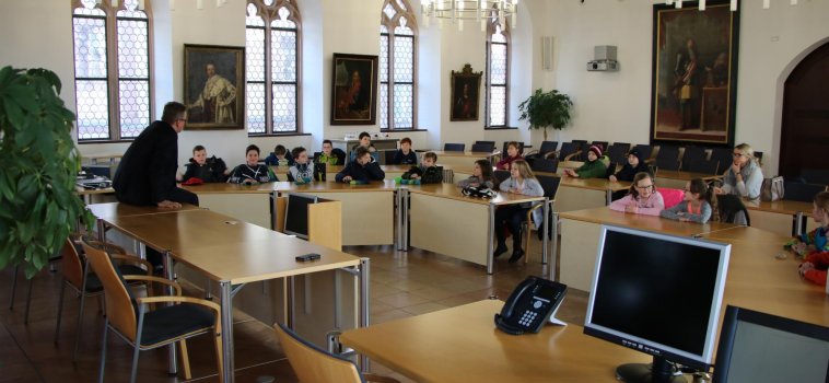 Der Lehrplan der vierten Klassen in der Grundschule sieht im Heimat- und Sachunterricht die Aufgaben in der Kommune vor. Wie auch in den vergangenen Jahren nahm sich deswegen Erster Bürgermeister Michael Göth die Zeit, den Schülern der KLasse 4b der Pestalozzi-Grundschule im historischen Rathaussaal Rede und Antwort zu stehen.