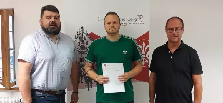 Erster Bürgermeister Stefan Frank und Personalamtsleiter Roland Maul übergaben ihm das Zeugnis und gratulierten zur bestandenen Prüfung recht herzlich.