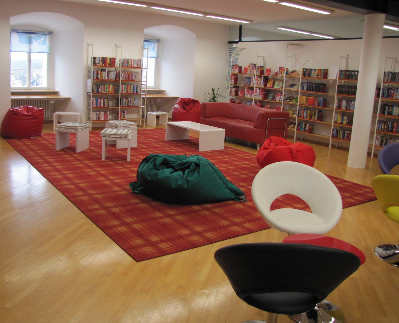 Ziel war es, einen Wohlfühlort zu schaffen, an dem sich die Besucher der Bibliothek gerne aufhalten. Dafür wurde ein Vintage-Teppich im Wert von über 1000 Euro dankenswerter Weise vom Förderverein der Stadtbibliothek gespendet. So wirkt der Raum nun um einiges größer und auch ruhiger, wodurch ein einladendes „Wohnzimmer-Feeling“ vermittelt wird.