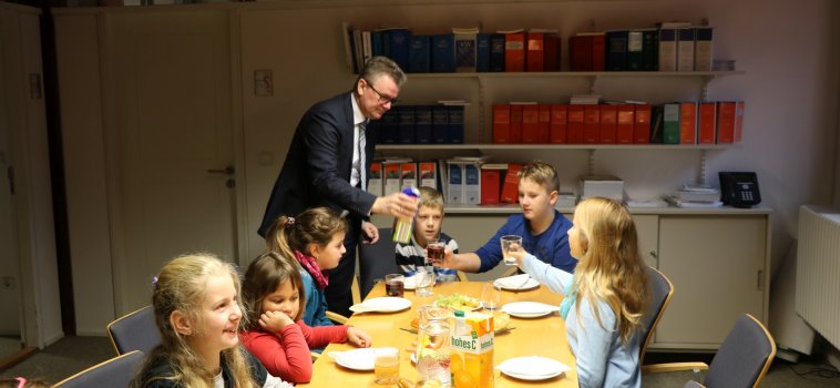 Der Kinder-Mitbring-Tag hat am schulfreien Buß- und Bettag Tradition . Zuerst lud Bürgermeister Michael Göth zum Frühstück. Da gab es allerlei Leckereien, welche von Organisatorin Rosalia Wendl angerichtet wurden. Sie sorgte sogar für frisch gepressten Apfelsaft aus dem eigenen Garten. Bürgermeister Michael Göth reichte Butterbrezen und Donuts und für den Vitaminkick Obst und Gemüse. Da waren die Augen groß, denn ein Frühstück mit dem Herrn Bürgermeister hat man ja auch nicht alle Tage.
