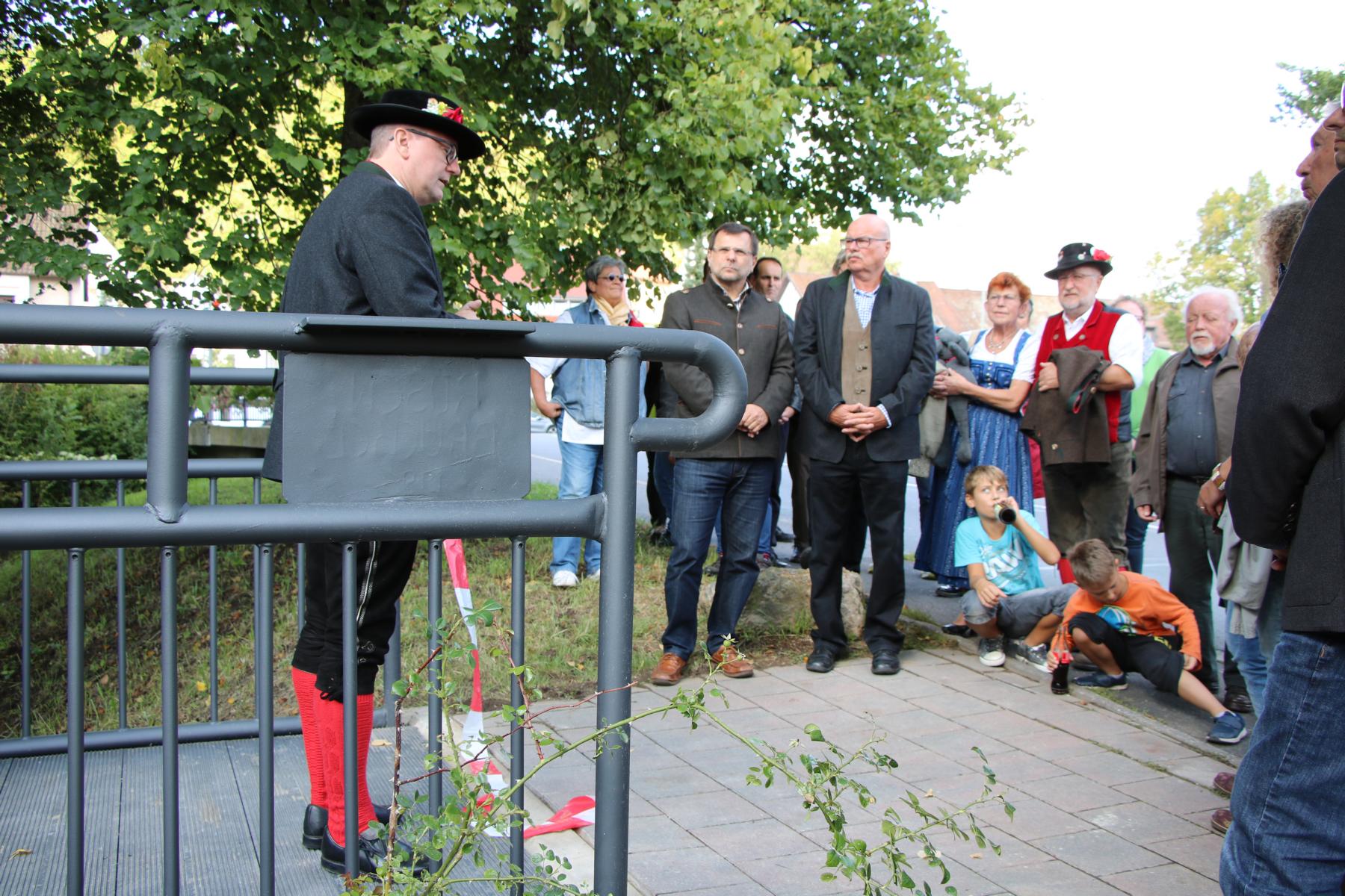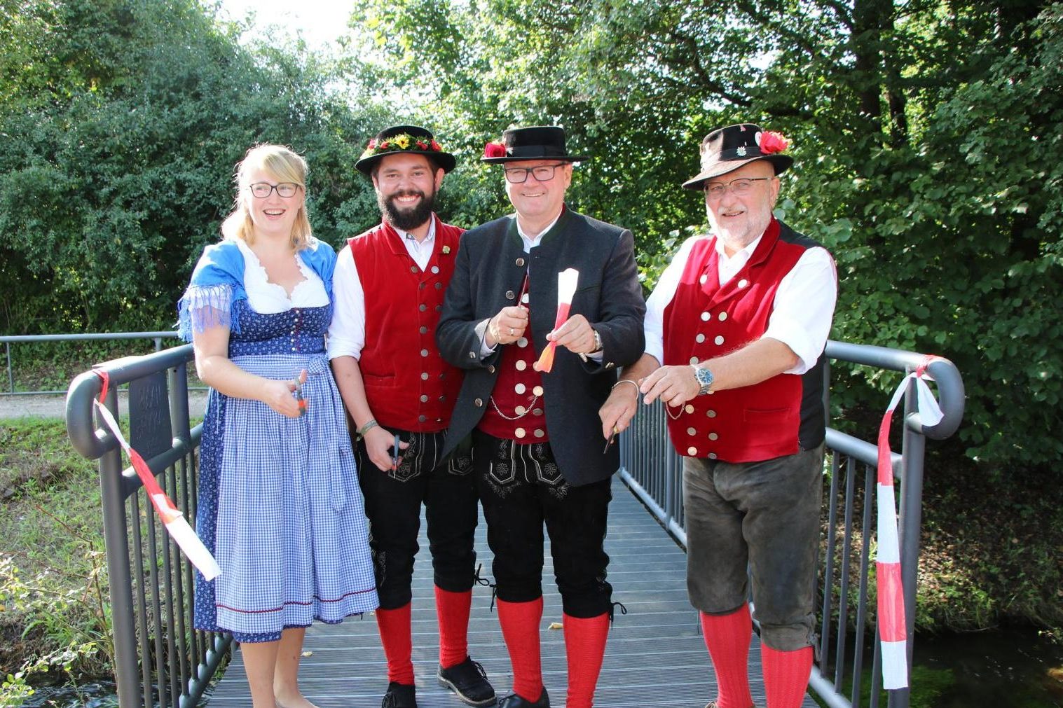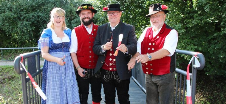 Außerdem freute sich Göth, dass das erneuerte Rosenbrückel, das ursprünglich im Jahre 1996 von Maxhüttenarbeitern erstellt wurde, wieder freigegeben werden konnte. Gemeinsam mit Sepp Lösch und dem diesjährigen Rosenberger Oberkirwapaar Nadine Mutzbauer und Philipp Sippl durchschnitt das Stadtoberhaupt dazu symbolisch ein Absperrband.