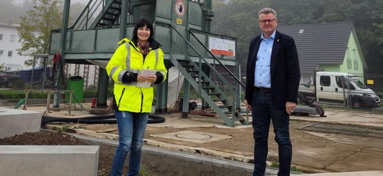 Christine Schaller-Kokesch vom Baureferat zeigte Erstem Bürgermeister Michael Göth nun den aktuellen Baufortschritt. Markant sind die Betonfertigteile, die Hammer und Schlegl darstellen. Sie können als Sitzmöglichkeit genutzt werden. Außerdem wird es zusätzliche Ruhebänke geben, eine Lademöglichkeit für E-Bikes und PKW-Stellplätze. Von beiden Seiten gibt es einen barrierefreien Weg. Neue Bepflanzung sorgt für zusätzliche Attraktivität.
