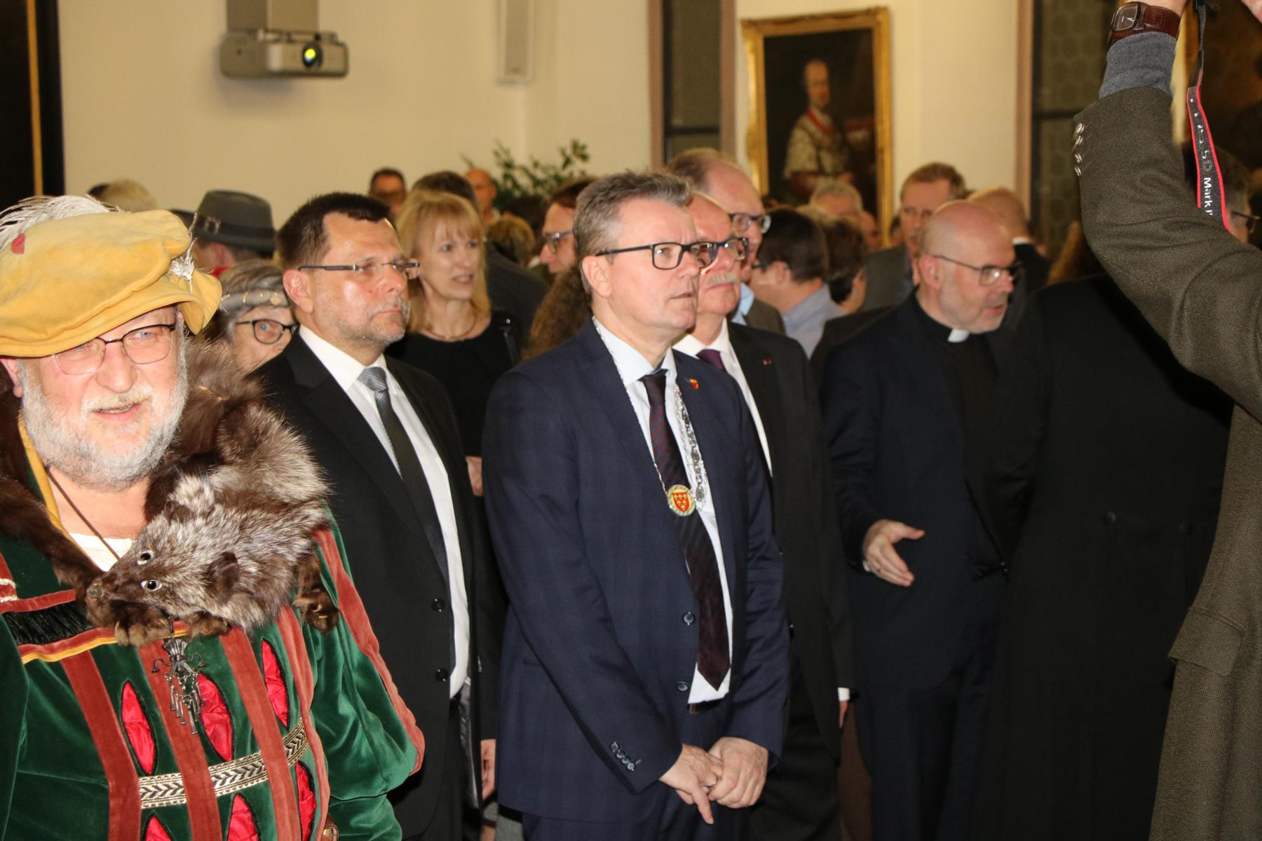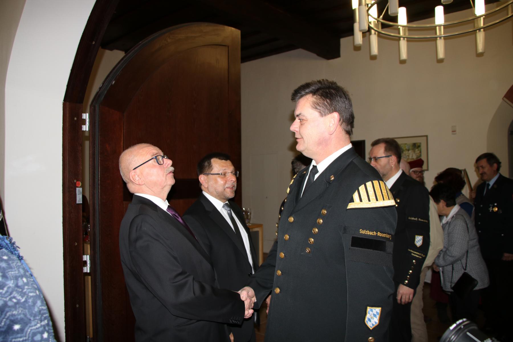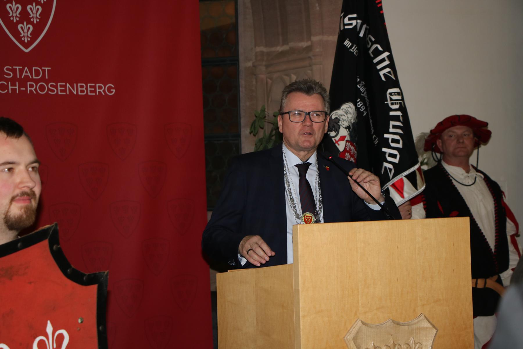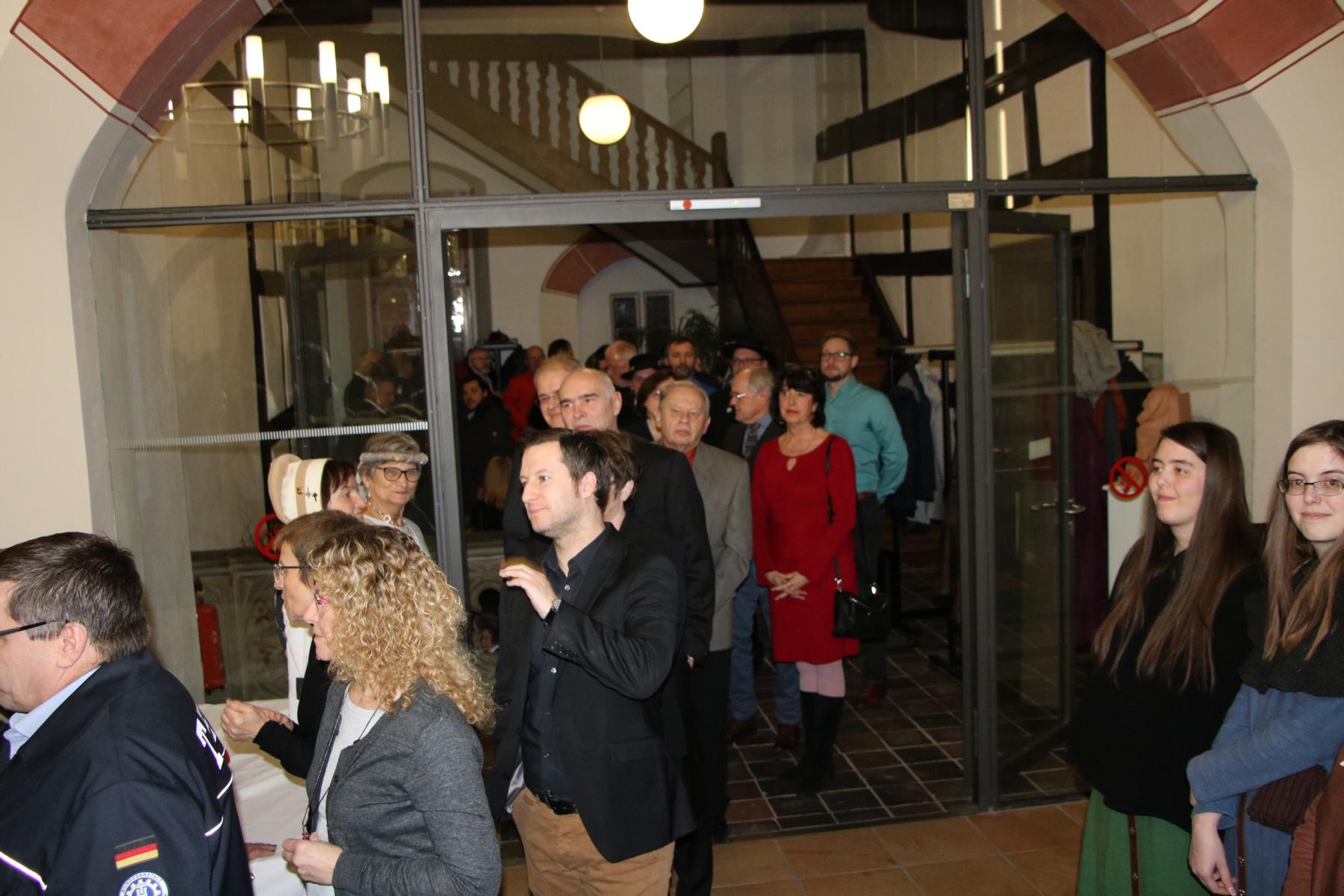 Bevor es aber soweit war galt es sich in Geduld zu üben: Bis zu knapp einer Stunde konnte es dauern, ehe man den historischen Rathaussaal betreten konnte: Galt es zunächst doch, die Neujahrsgrüße der drei Bürgermeister der Stadt Sulzbach-Rosenberg im Rahmen eines Defilées entgegenzunehmen. Wie bereits in den Vorjahren hatten die Bürgermeister dabei hochrangigen Schutz in Gestalt der historischen Gruppe Stiber-Fähnlein.