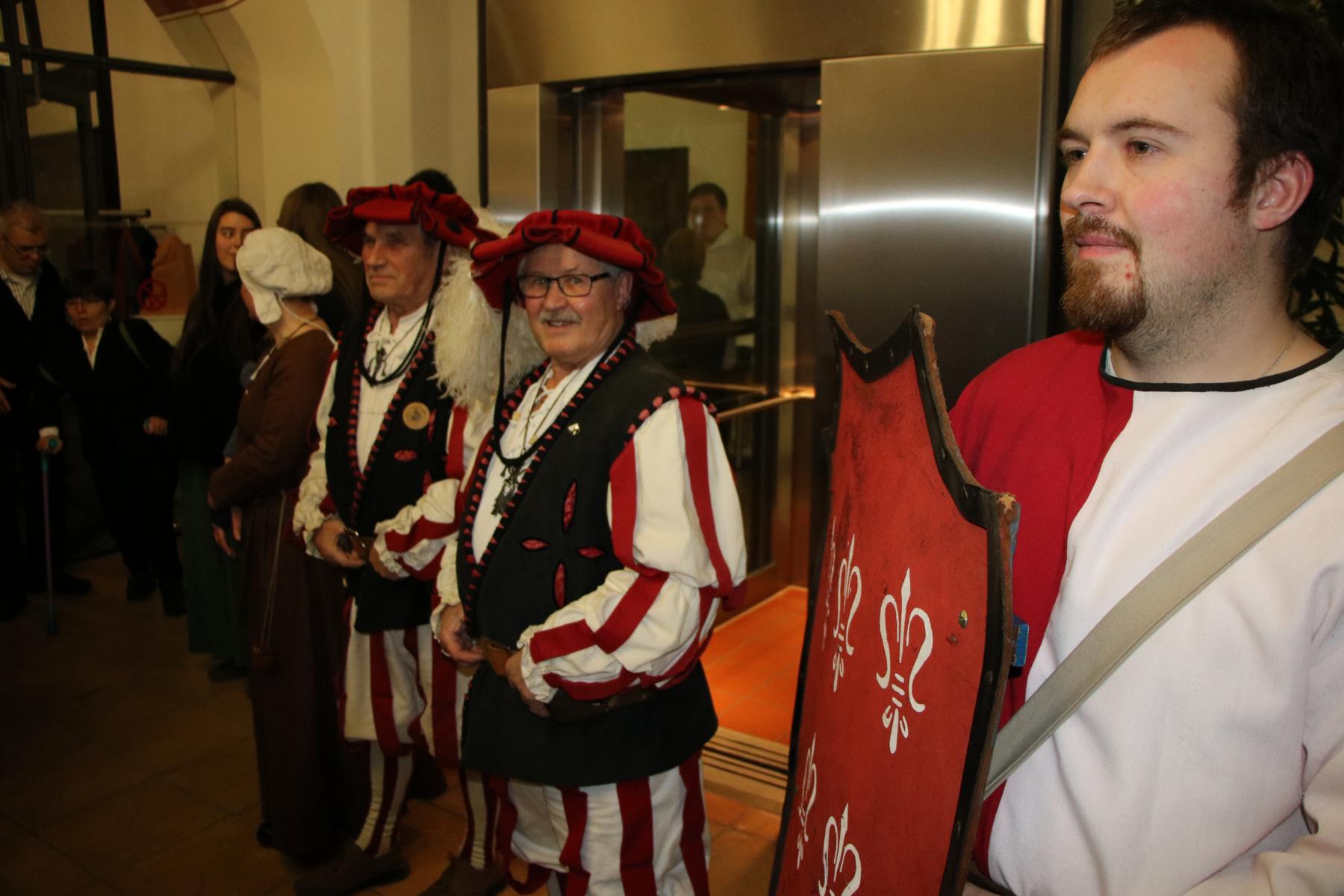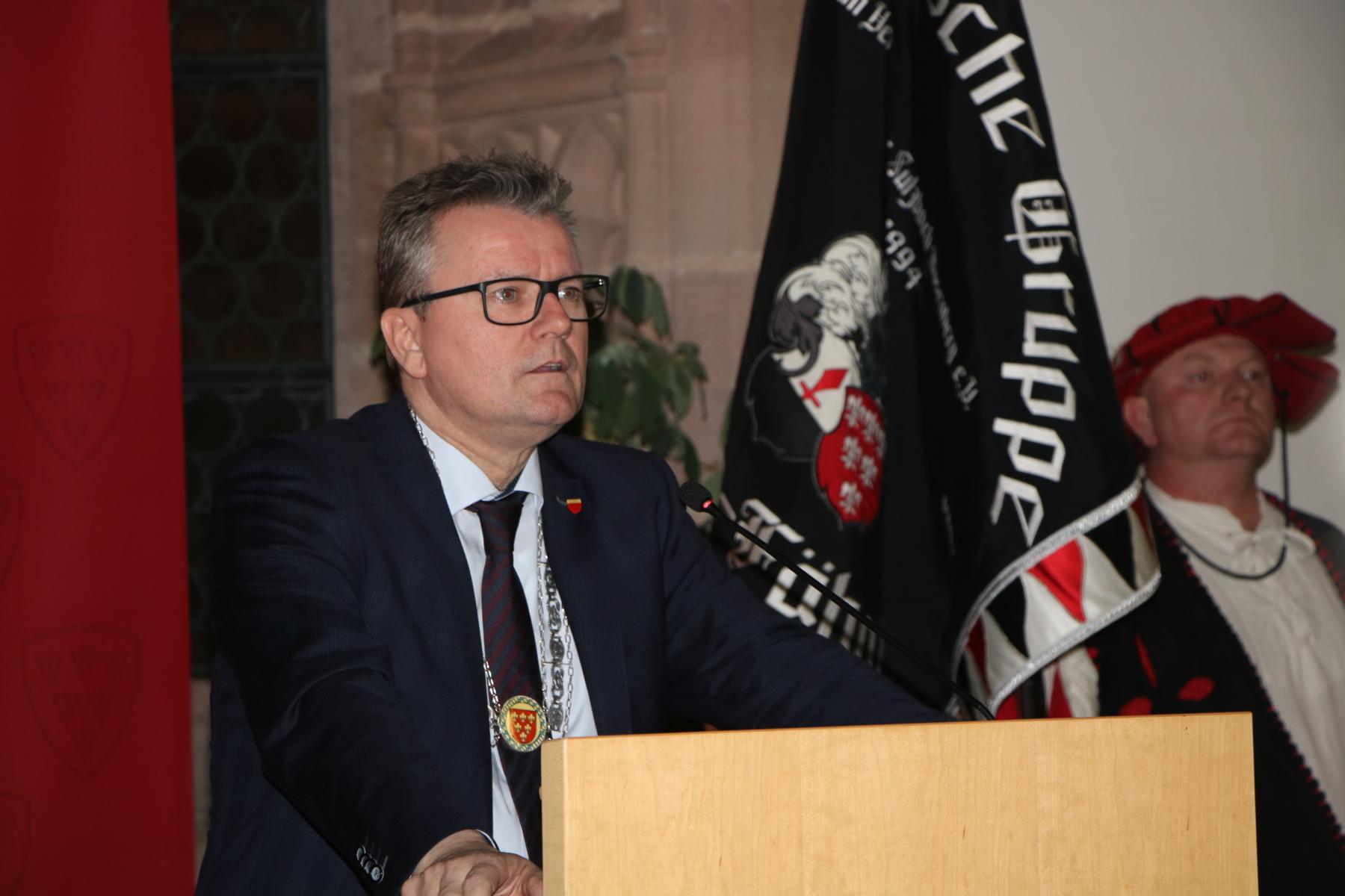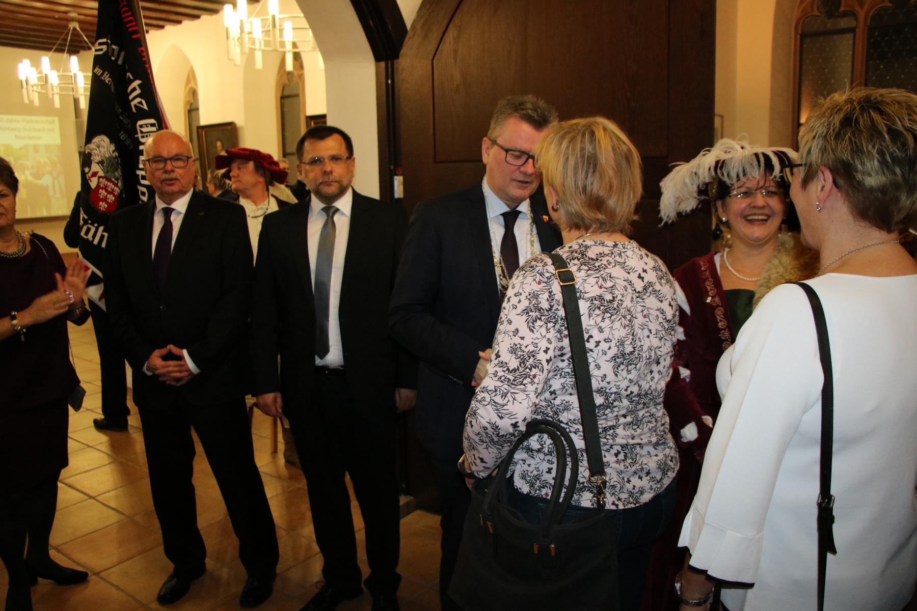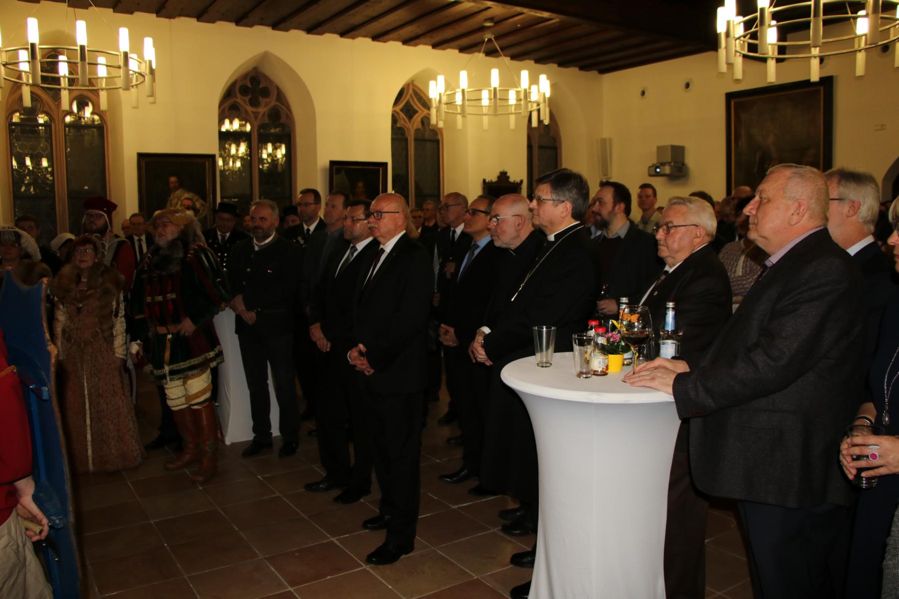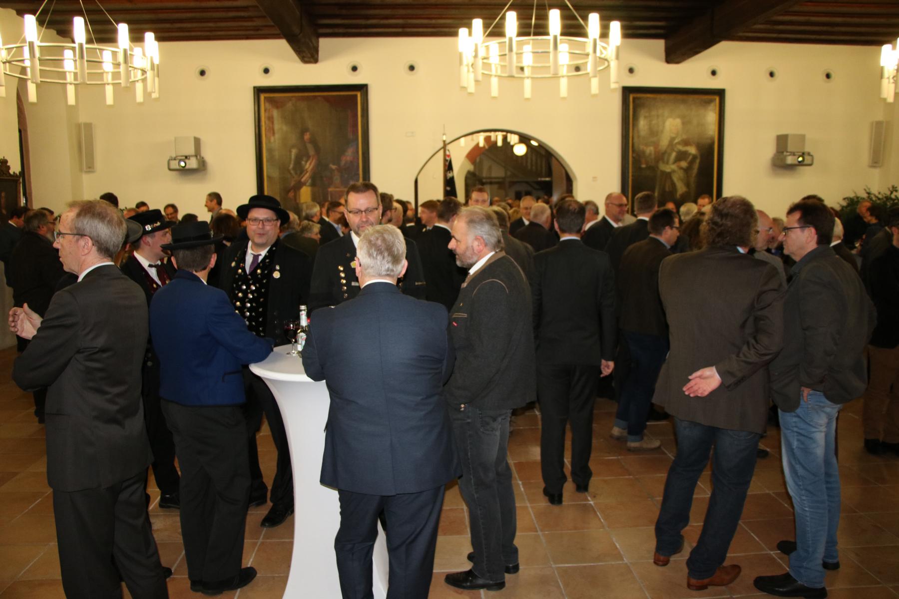 Bevor es aber soweit war galt es sich in Geduld zu üben: Bis zu knapp einer Stunde konnte es dauern, ehe man den historischen Rathaussaal betreten konnte: Galt es zunächst doch, die Neujahrsgrüße der drei Bürgermeister der Stadt Sulzbach-Rosenberg im Rahmen eines Defilées entgegenzunehmen. Wie bereits in den Vorjahren hatten die Bürgermeister dabei hochrangigen Schutz in Gestalt der historischen Gruppe Stiber-Fähnlein.