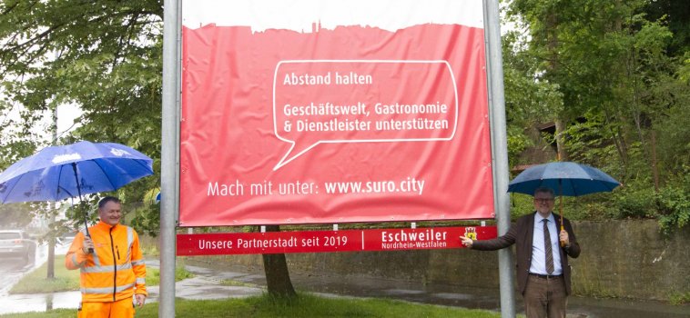 Erster Bürgermeister Michael Göth setze sich daraufhin, gemeinsam mit Stadtmarketing und Bauhof, dafür ein diese Partnerschaft dauerhaft im Stadtbild zu verankern. Auch Eschweilers Bürgermeister Rudi Bertram zeigte sich der Idee gegenüber aufgeschlossen und stellte bereitwillig das Eschweiler Stadtwappen zur Verfügung. Insgesamt fünf Partnerstadtschilder hat der städtische Bauhof nun an den Ortseingängen installiert.