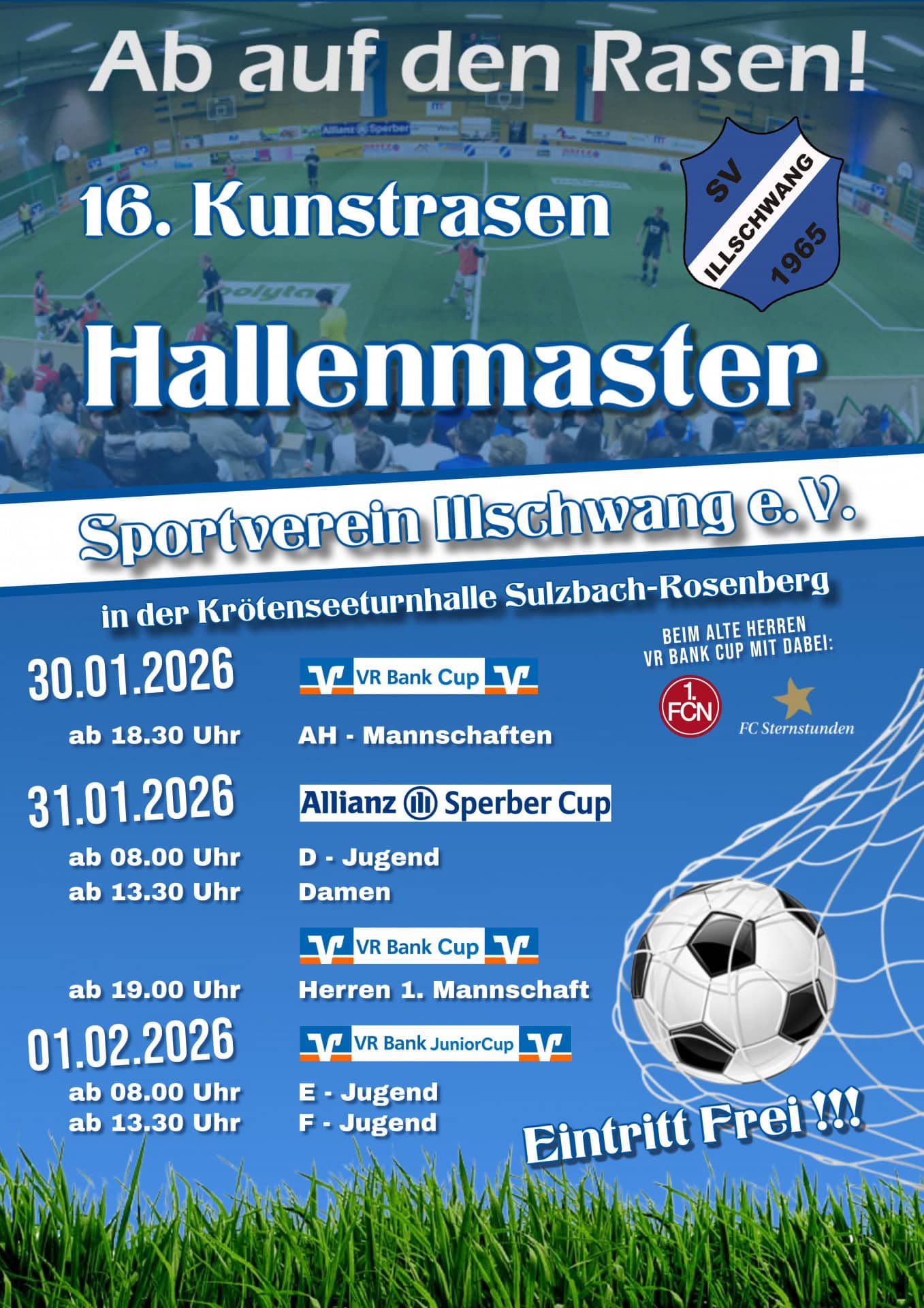 Das mittlerweile 16.Kunstrasenhallenturnier, mit Rundumbande, des SV Illschwang findet vom Freitag, 30. Januar bis Sonntag, 1.Februar 2026 in der Krötensee-Sporthalle in Sulzbach-Rosenberg statt.