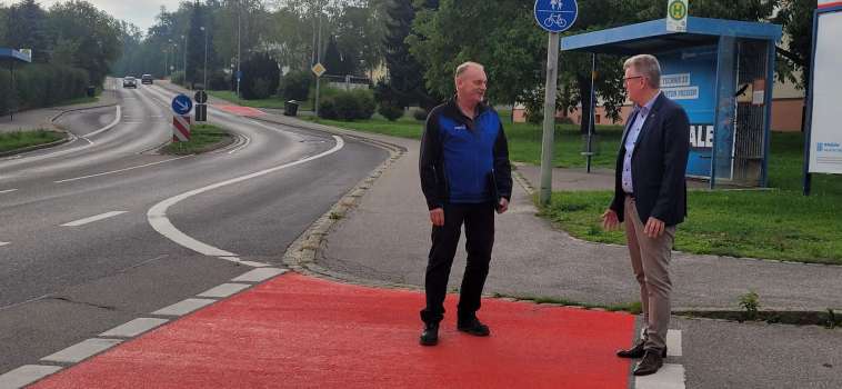 Bis heute hat der Städtische Bauhof schon einen Großteil der Radwege, die über Straßeneinmündungen laufen, rot markiert. Bauhofleiter Erwin Thurner zeigte Erstem Bürgermeister Michael Göth nun das Ergebnis am Tafelberg. Dort kreuzen einige Einmündungen den Radweg, diese sind durch die roten Markierungen ab sofort für beide Verkehrsteilnehmer weithin sichtbar. Denn auch die Radfahrer werden so gewarnt, dass Autos abbiegen bzw. in die Straße einfahren könnten. Gerade auch für die zahlreichen Radtouristen ohne Ortskenntnis auf dieser Strecke, die zum Fünf-Flüsse-Radweg gehört, eine Maßnahme, die viel zur Sicherheit beiträgt.