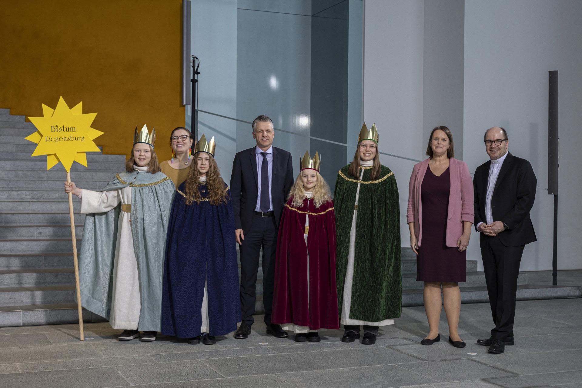 Zum Gruppenfoto mit Thorsten Frei, Chef des Bundeskanzleramts, stellten sie sich gemeinsam auf mit Pfarrer Dirk Bingener, Präsident des Kindermissionswerks ‚Die Sternsinger‘, und Daniela Hottenbacher, Bundesvorsitzende des Bundes der Deutschen Katholischen Jugend (BDKJ).