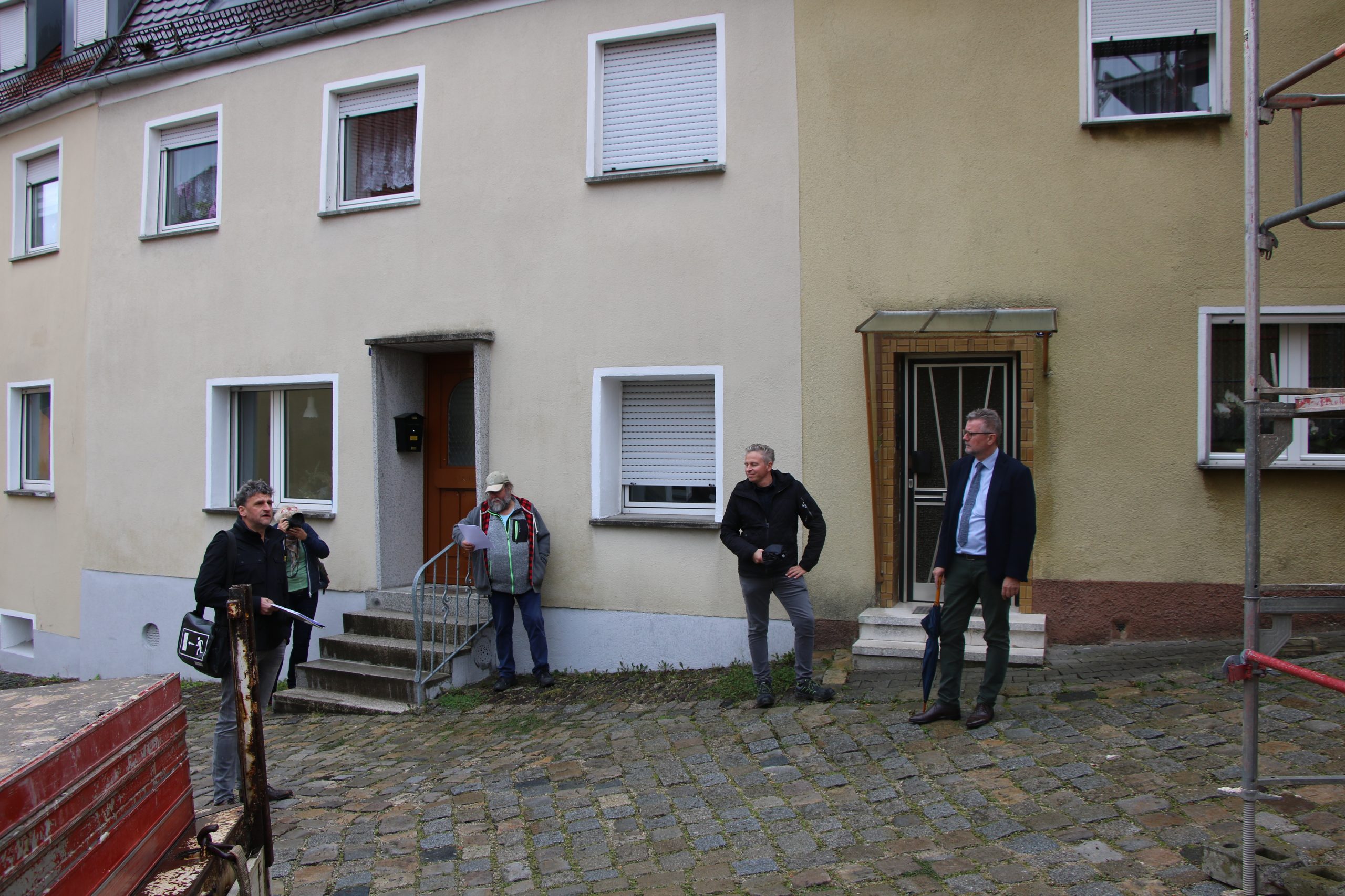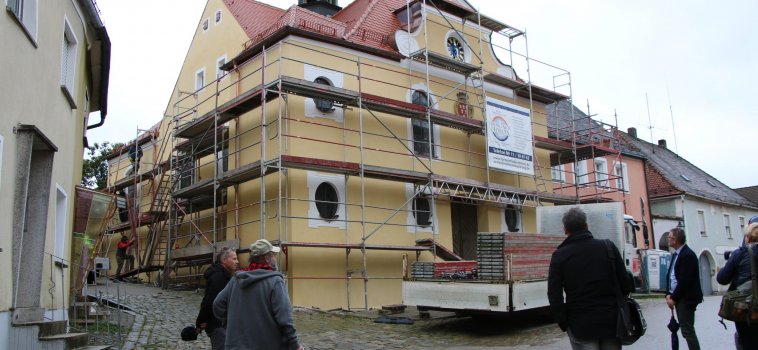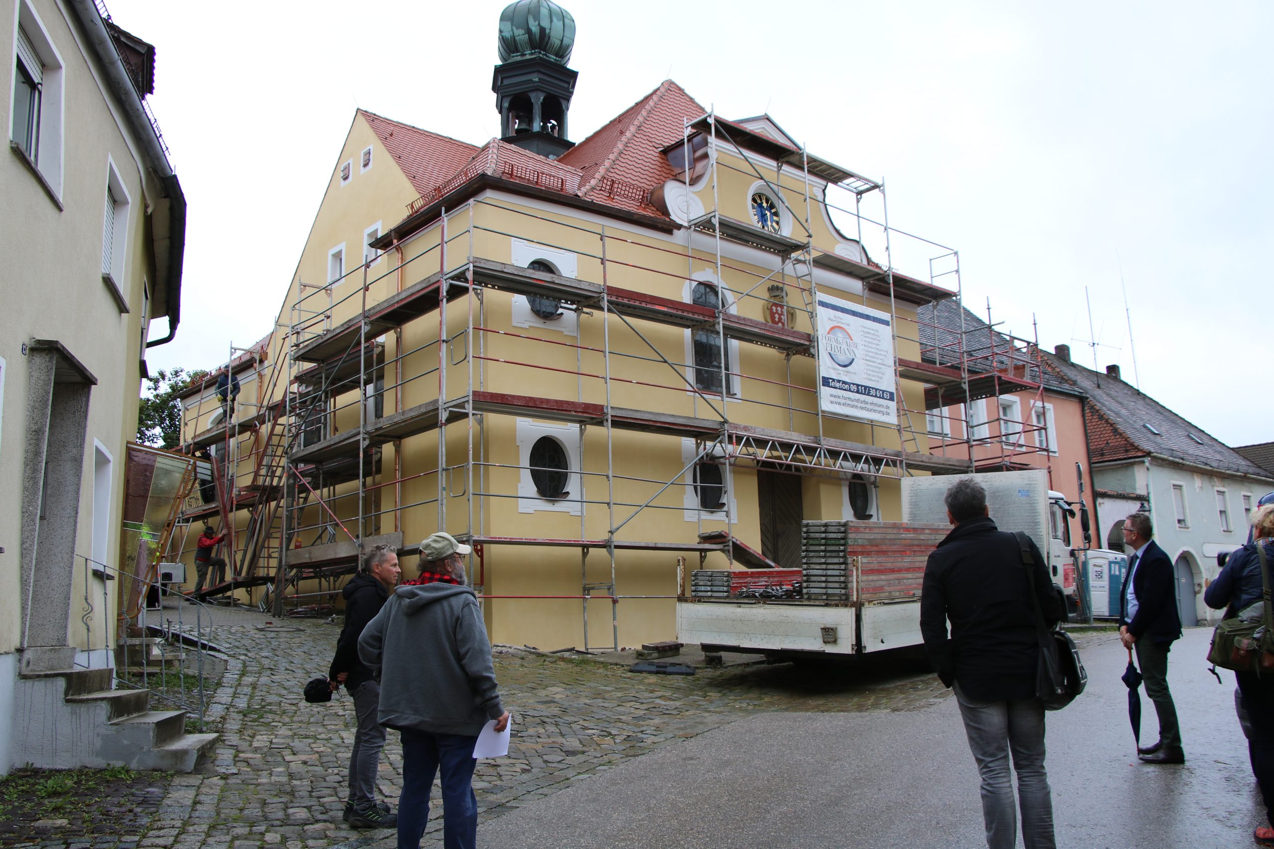 Erster Bürgermeister Michael Göth informierte sich bei Bauleiter Markus Hofmann und dem leitenden Architekt Martin Kunert über den Fortschritt der Sanierungsmaßnahme.